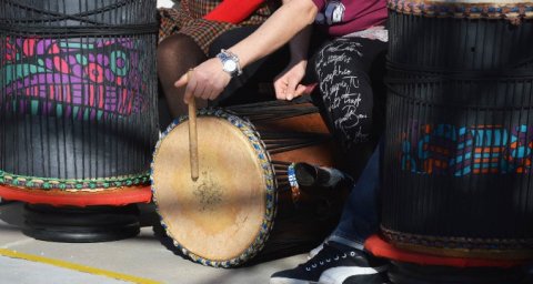 Aquí reuniremos a todo el grupo en un solo espacio y aprenderán lecciones básicas sobre percusión con tambores... el objetivo final de este taller será el de que todos actuen juntos al final, como un único grupo.